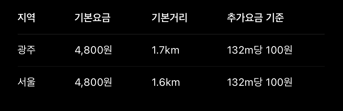 • 심야할증: 23시-24시, 2시-4시 : 20% 인상