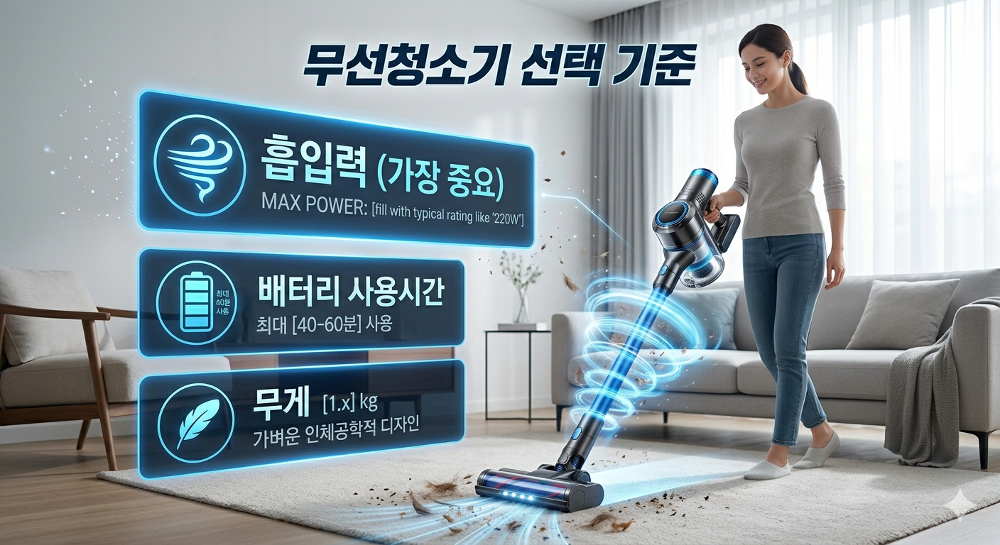 무선청소기는 흡입력과 배터리를 중심으로 선택하면 실패할 확률이 낮습니다.