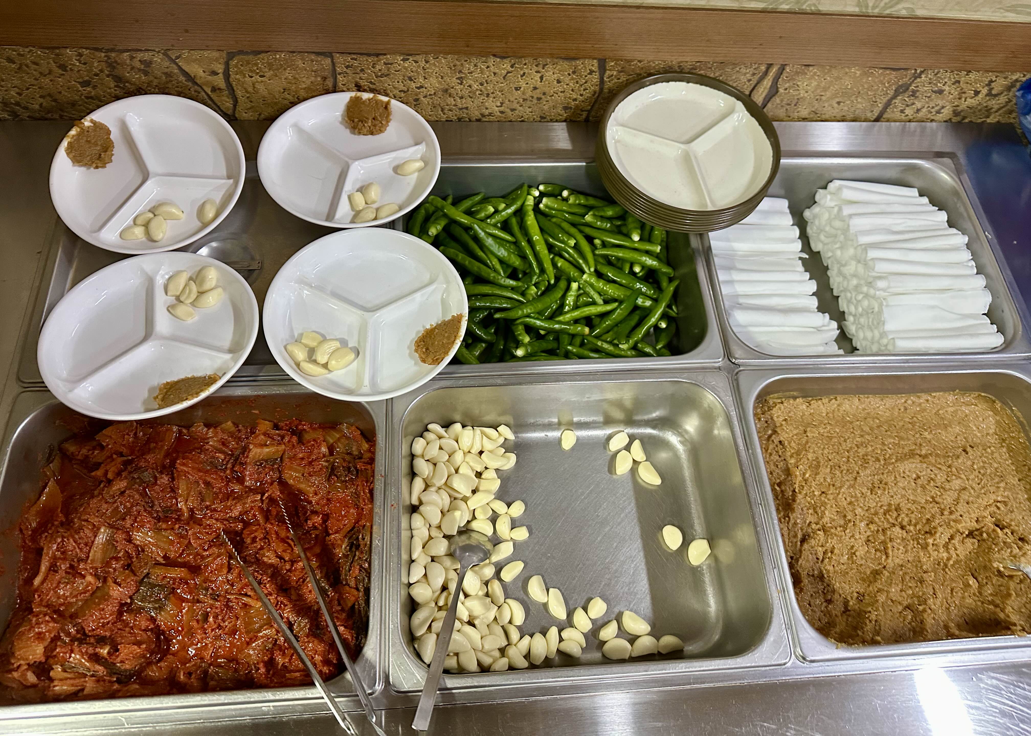 셀프바가 따로 있어서 김치, 마늘, 쌈장 리필도 자유롭고 계란찜도 부드럽고 간이 딱 맞아서 사이드로 최고였어요.