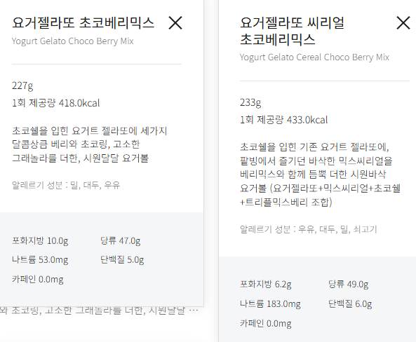 요거젤라또 한끼 칼로리는 초코베리믹스는 418kcal, 시리얼은 433kcal이네요!