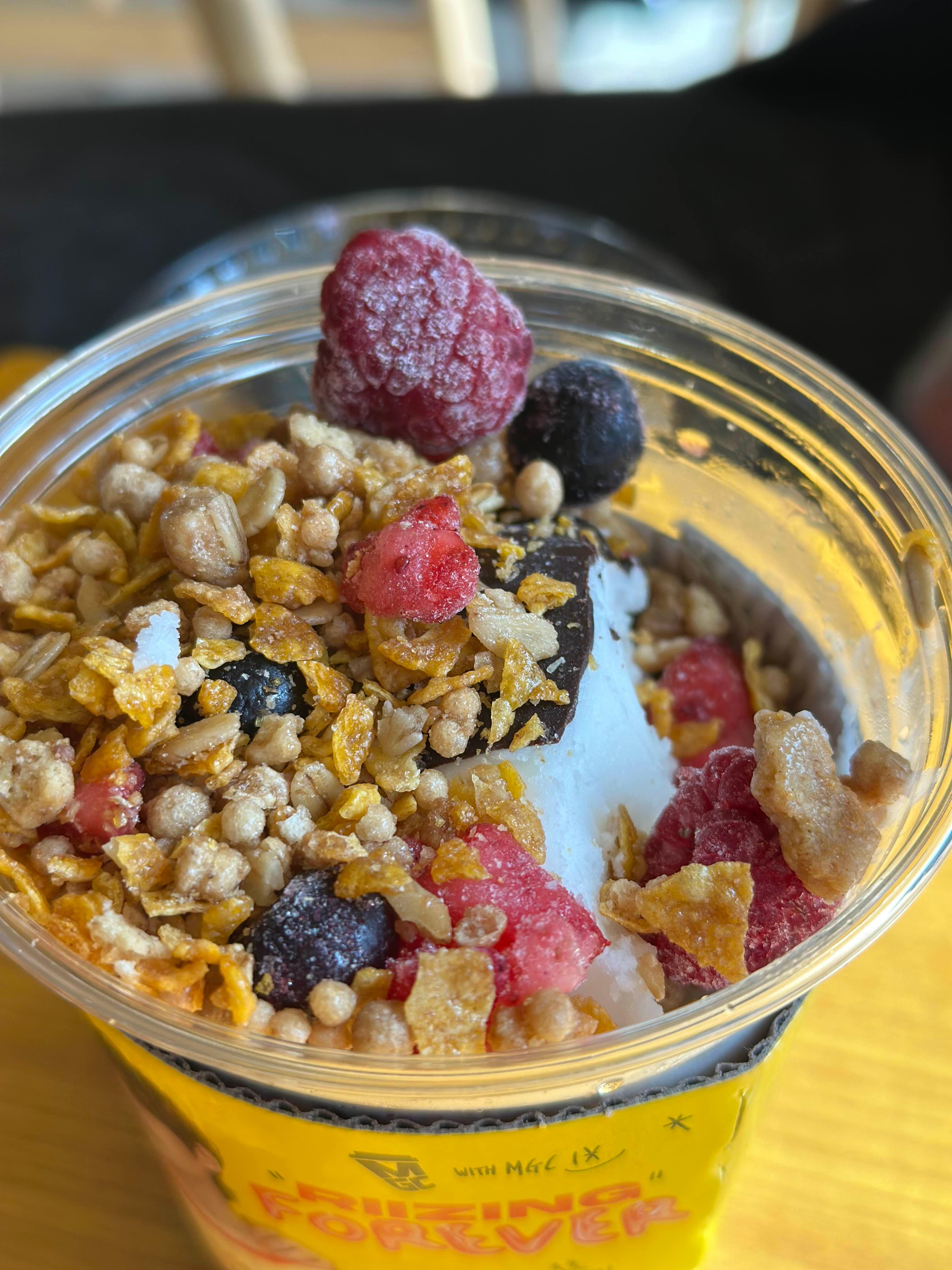 위에는 그래놀라, 씨리얼, 블루베리, 라즈베리 등 토핑이 풍성하게 올라가 있고