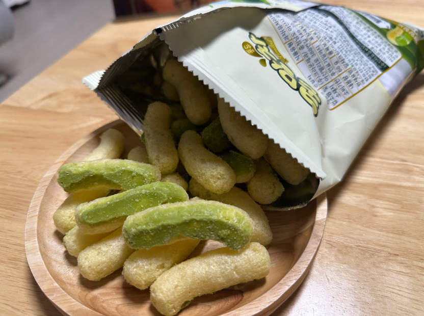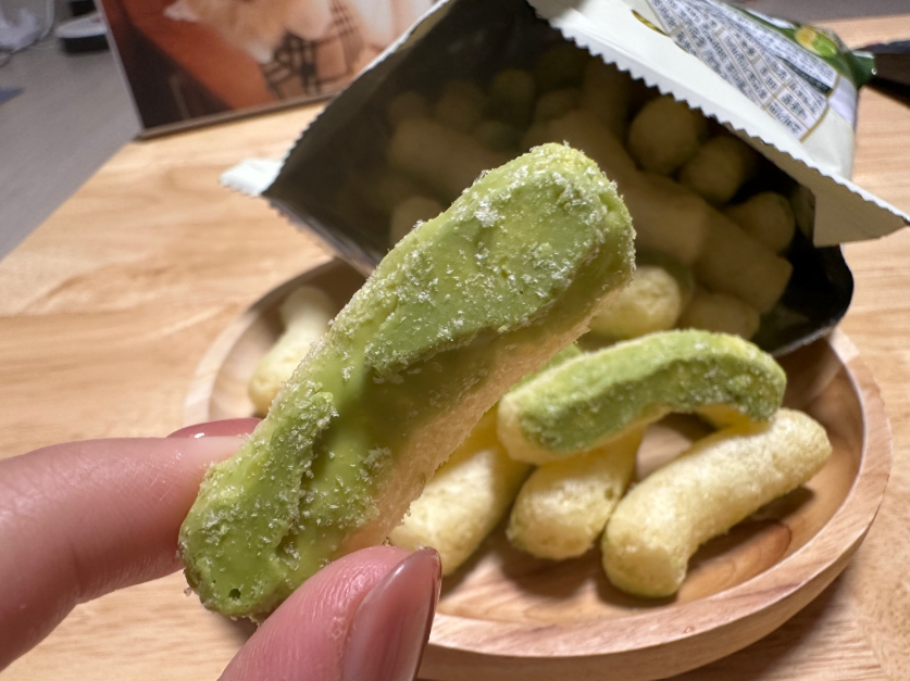 겉면은 말차 코팅이 살짝 입혀져 있고 속은 바삭한 콘스낵!